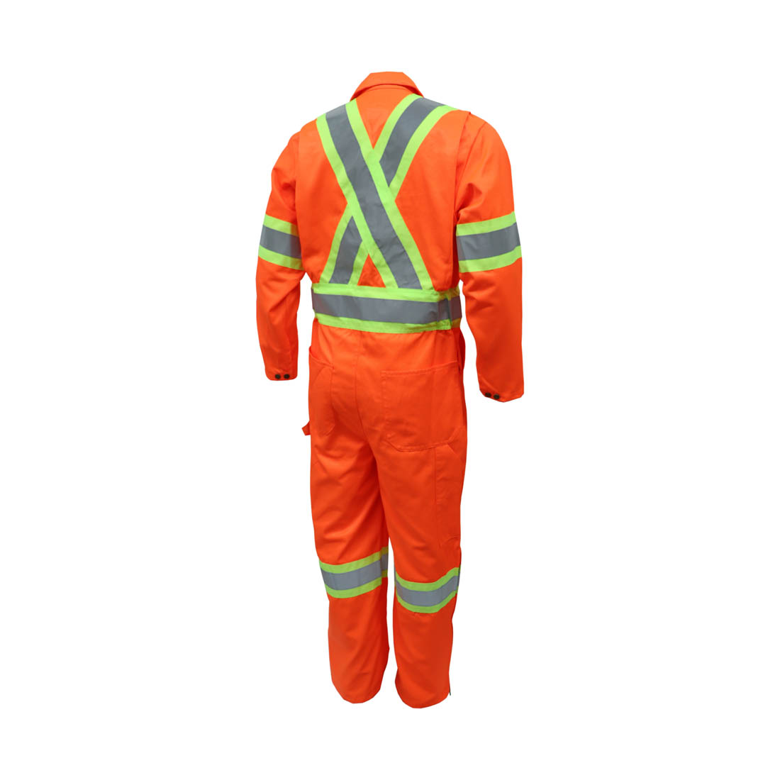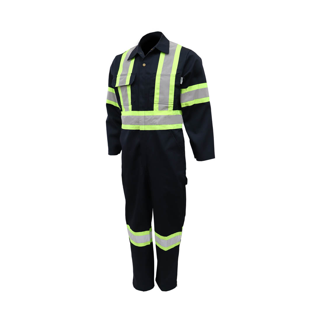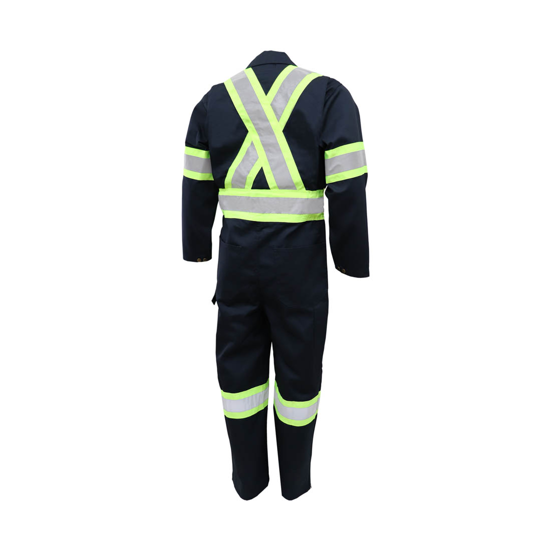 – Bandes réfléchissantes argent 2’’ de largeur sur tissu gros grain jaune fluorescent 4‘’ de largeur (à la taille, poitrine, bras, jambes & x au dos)