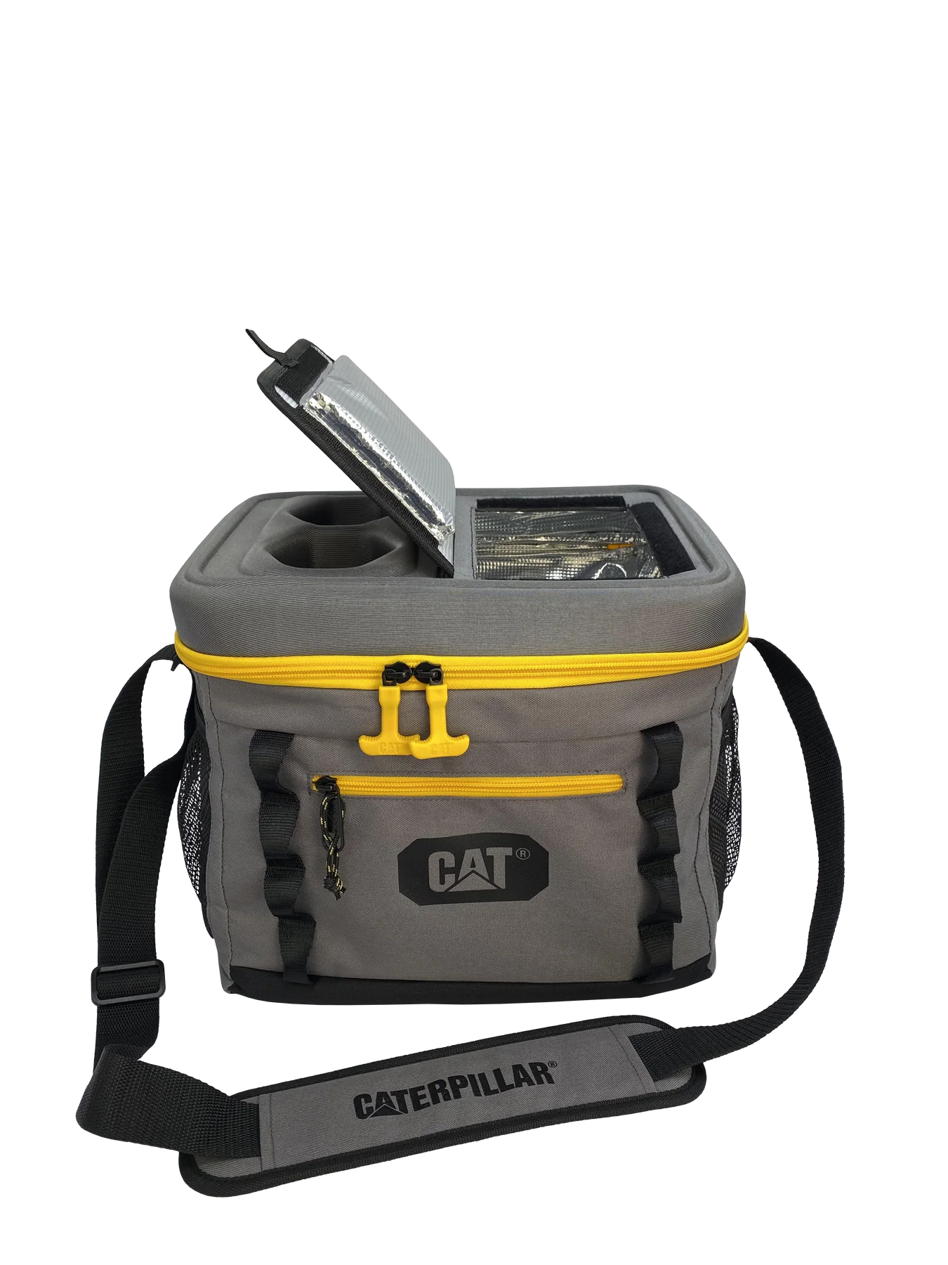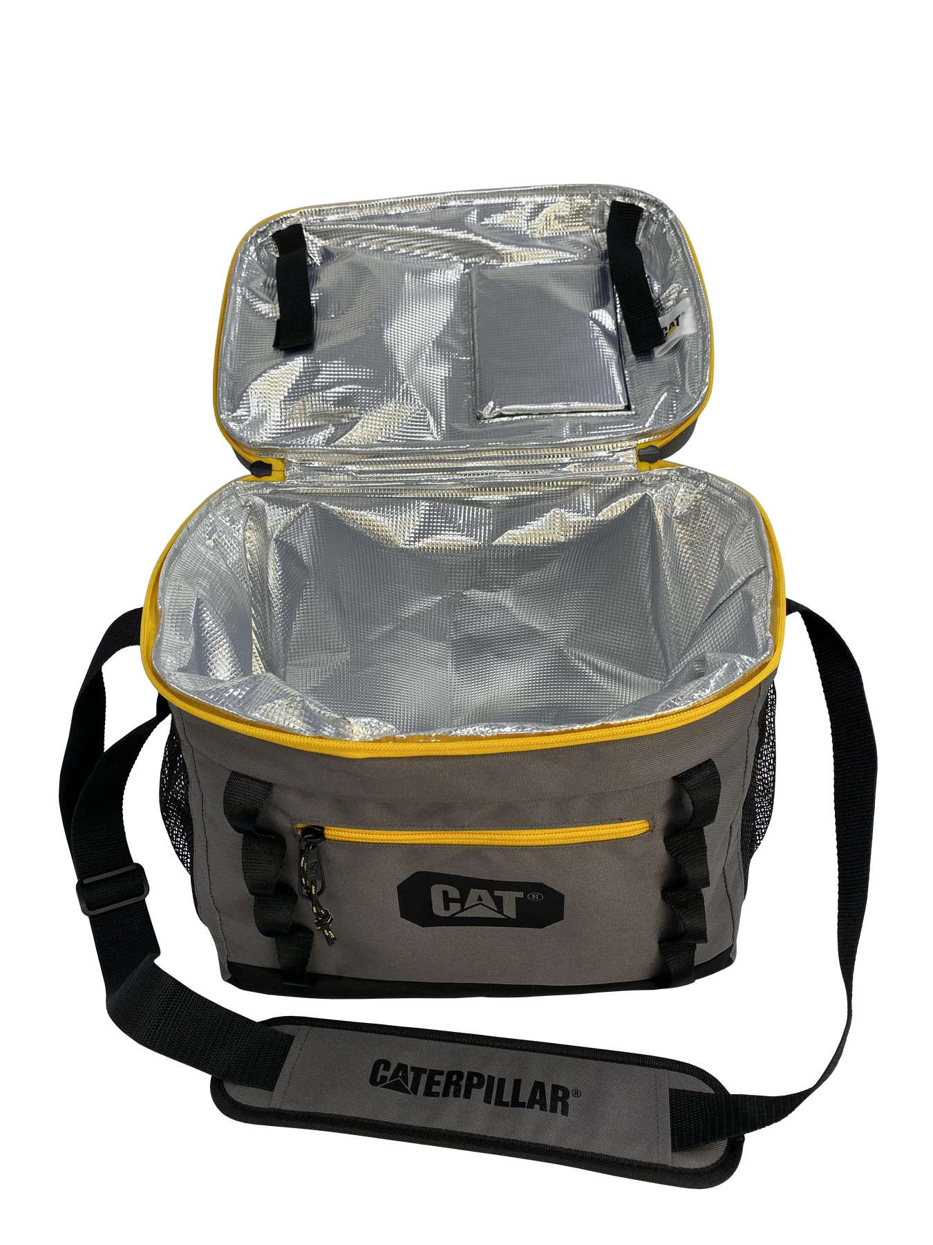 Glacière conservant les produits au frais. La glacière Caterpillar dispose d’une capacité de 24 canettes et est facilement transportable grâce à une courroie à l’épaule.